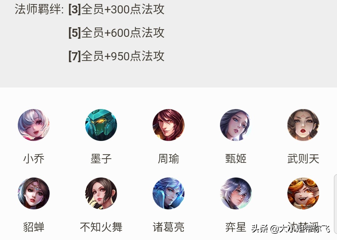 目前能够产生法师羁绊的有小乔、墨子、周瑜、甄姬、武则天、貂蝉、火舞、诸葛亮、沈梦溪、奕星共10位英雄组成。
