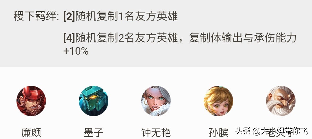 所谓复制流,便是凑齐这稷下羁绊,2层复制一名英雄,4层复制2名英雄,这里面相关英雄有廉颇、墨子、孙膑、钟无艳、老夫子共五位英雄。