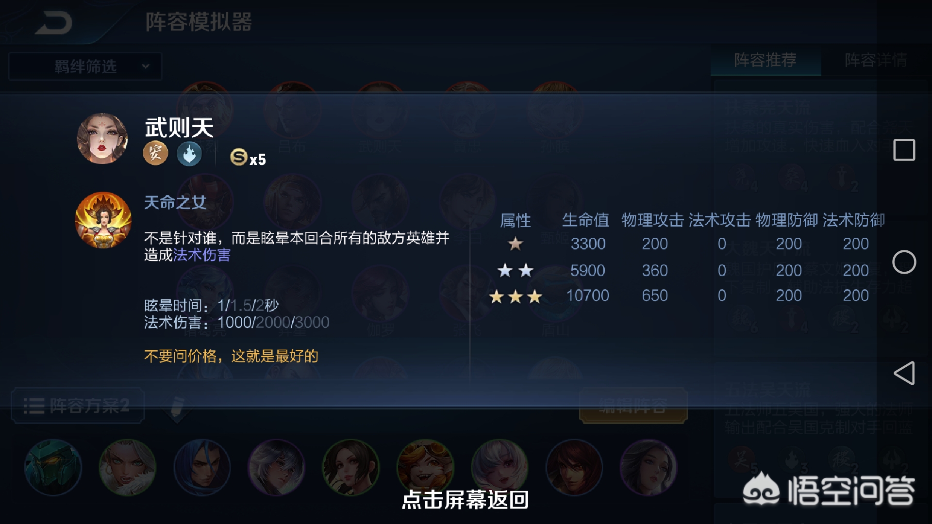 如果后期金币够用的话,可以把弈星或小乔换成武则天,武则天这个模拟战中最贵的英雄可是真的物有所值,技能太强力了,全员控制且伤害特别高。
