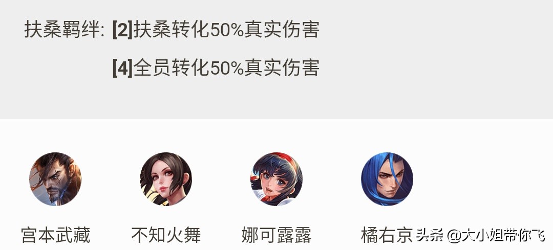 因为前两个羁绊中有一个墨子可通用,所以在9级的时候我们可以选一个扶桑刺客跟火舞进行搭配,形成扶桑羁绊效果,有助于火舞再次提升秒人能力。